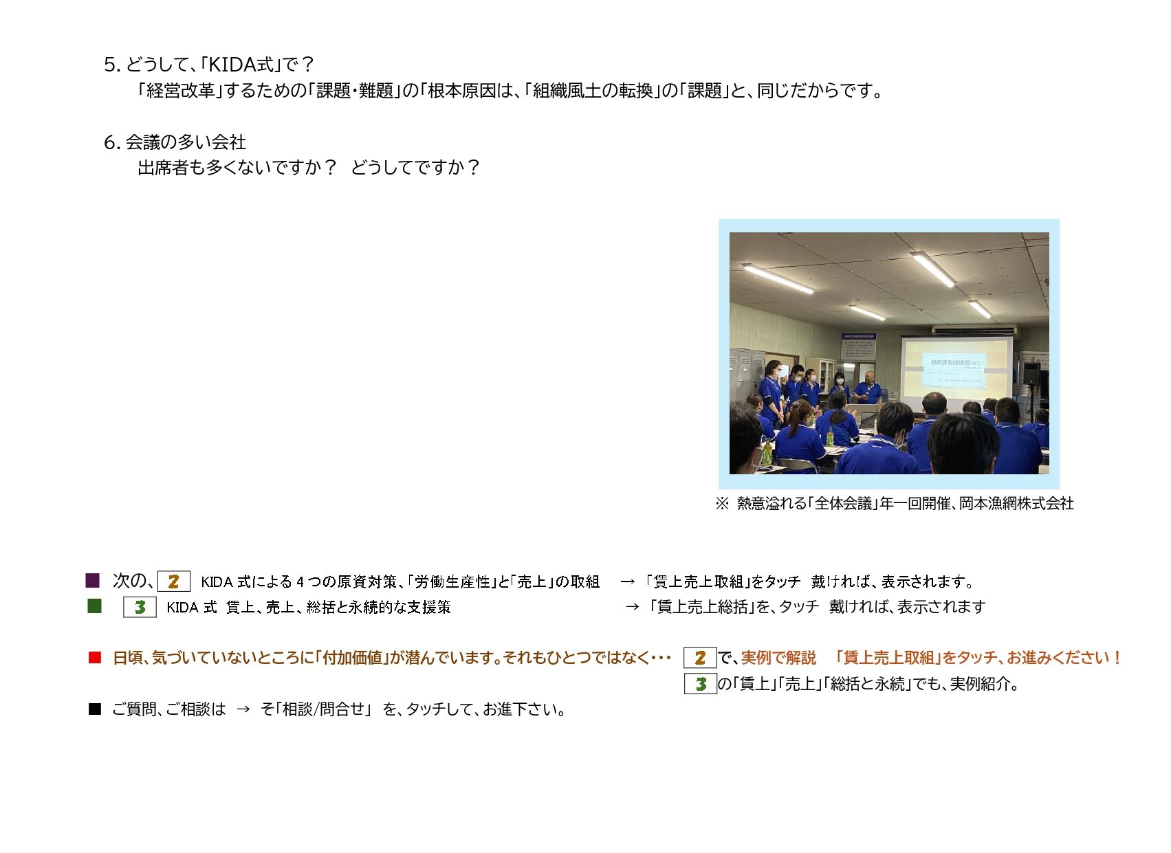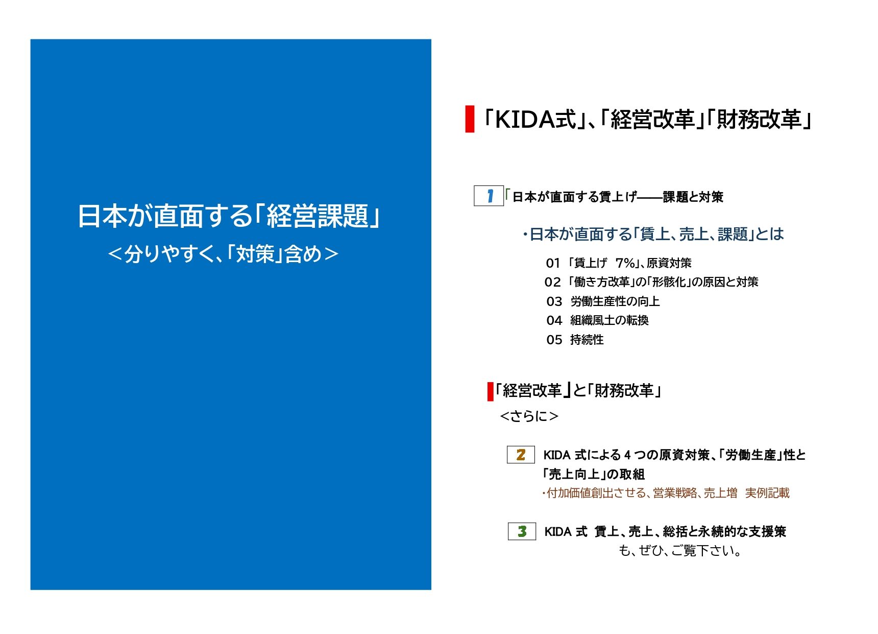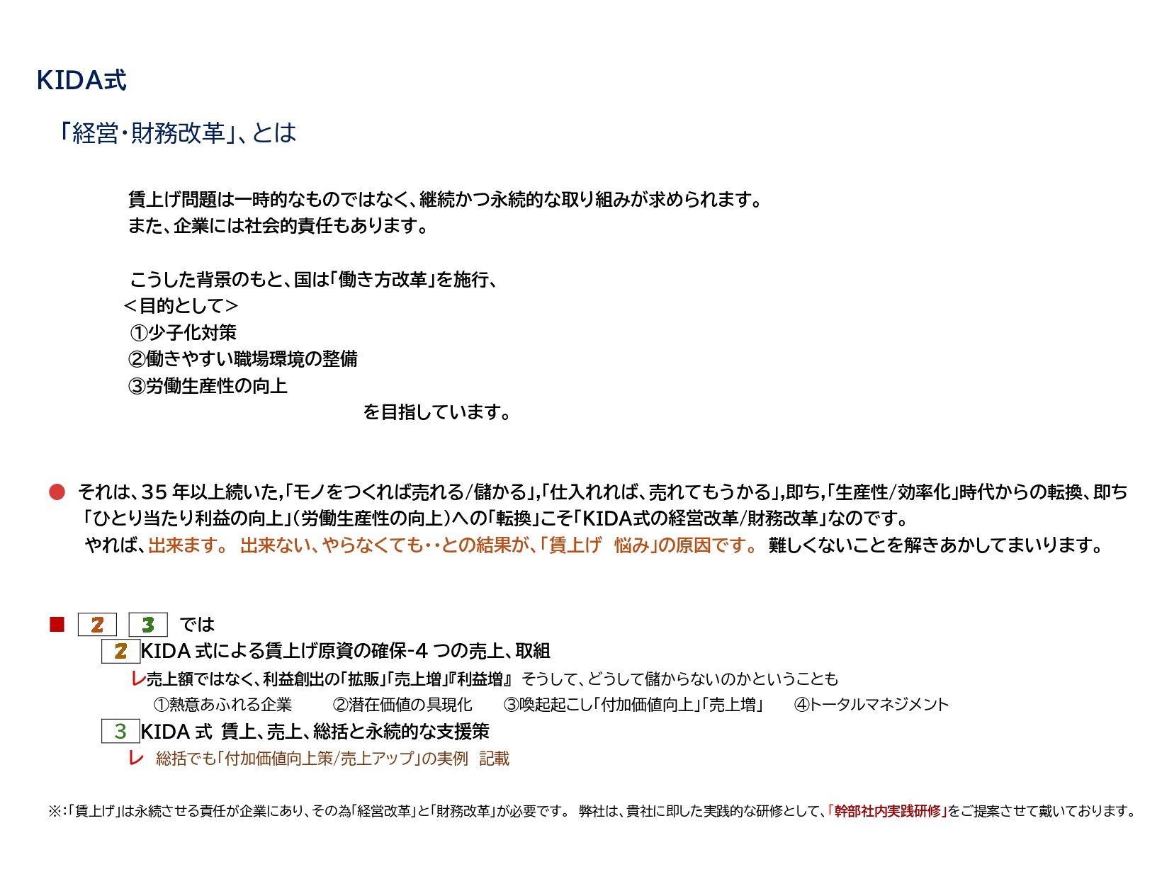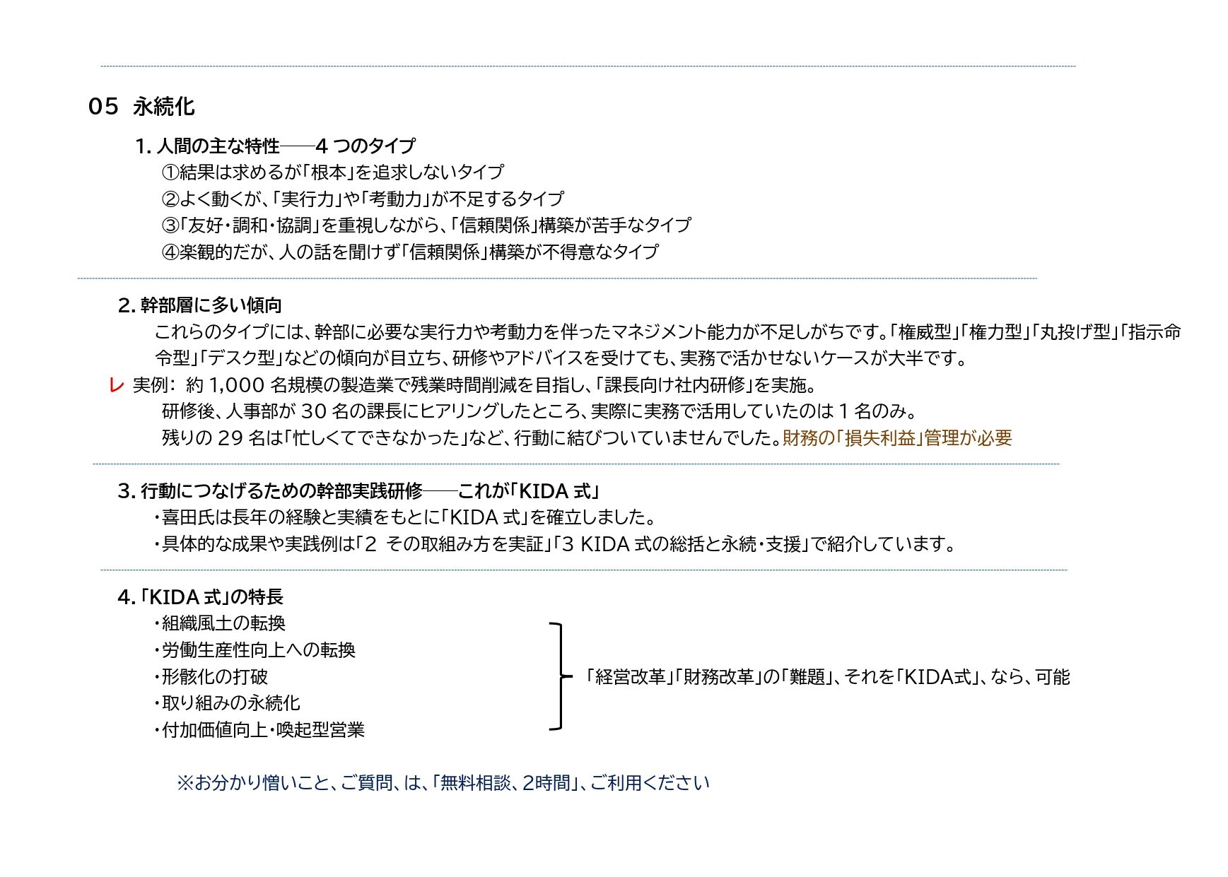 ______ 1. 人間の特性について 2. 幹部層に多い傾向 3.行動につなげる為の「KIDA式」による幹部実践研修 4.「KIDA式の特徴