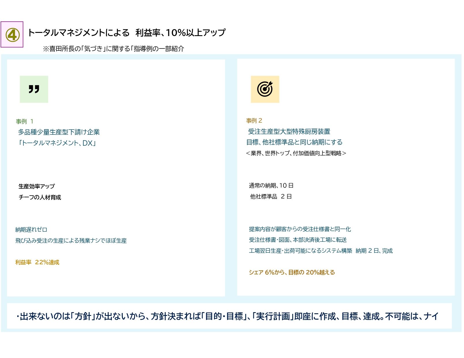 _____例:受注生産・出荷システムの自社開発等で納期短縮・効率化を実現。明確な方針と目標設定が成長の要です。